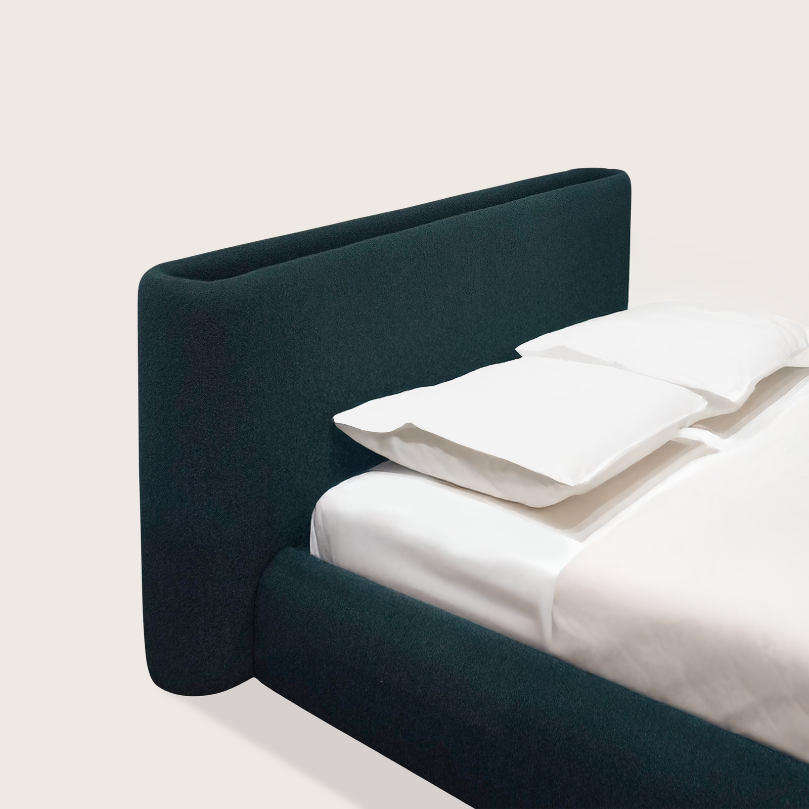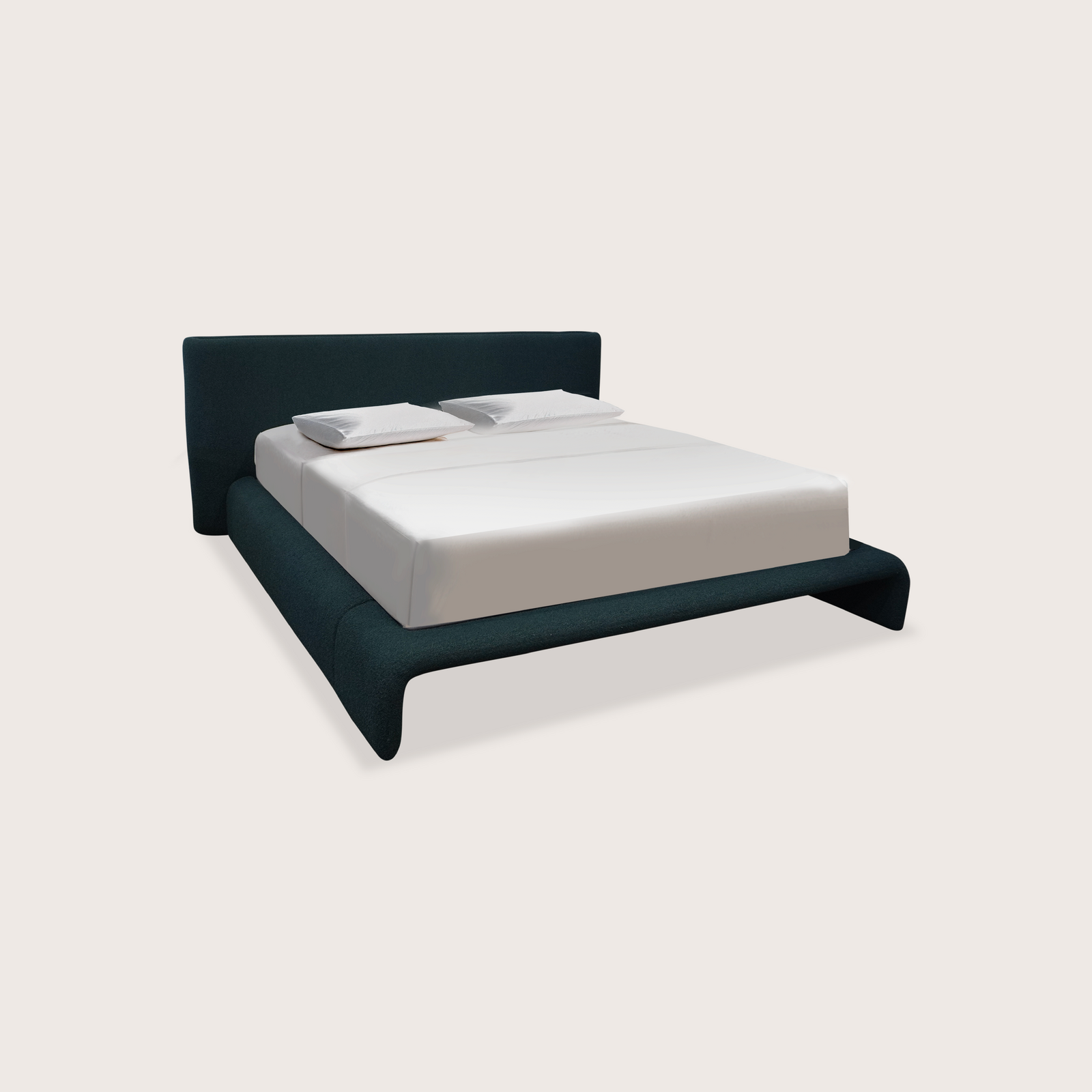 A sleek and modern bed featuring a low-profile frame and an elegantly curved upholstered headboard. Its refined silhouette and plush fabric bring effortless sophistication to any bedroom.
