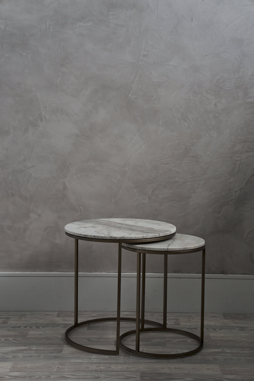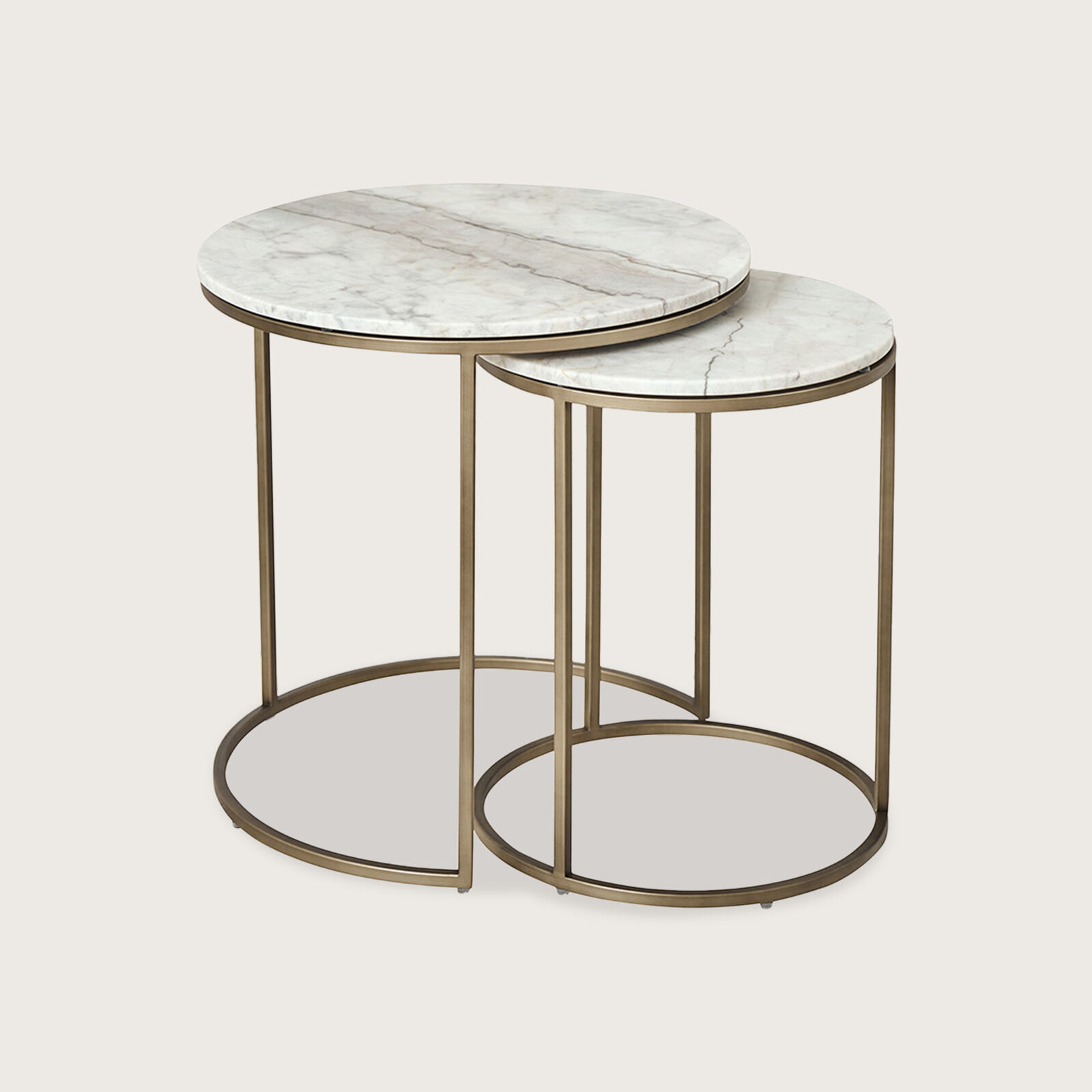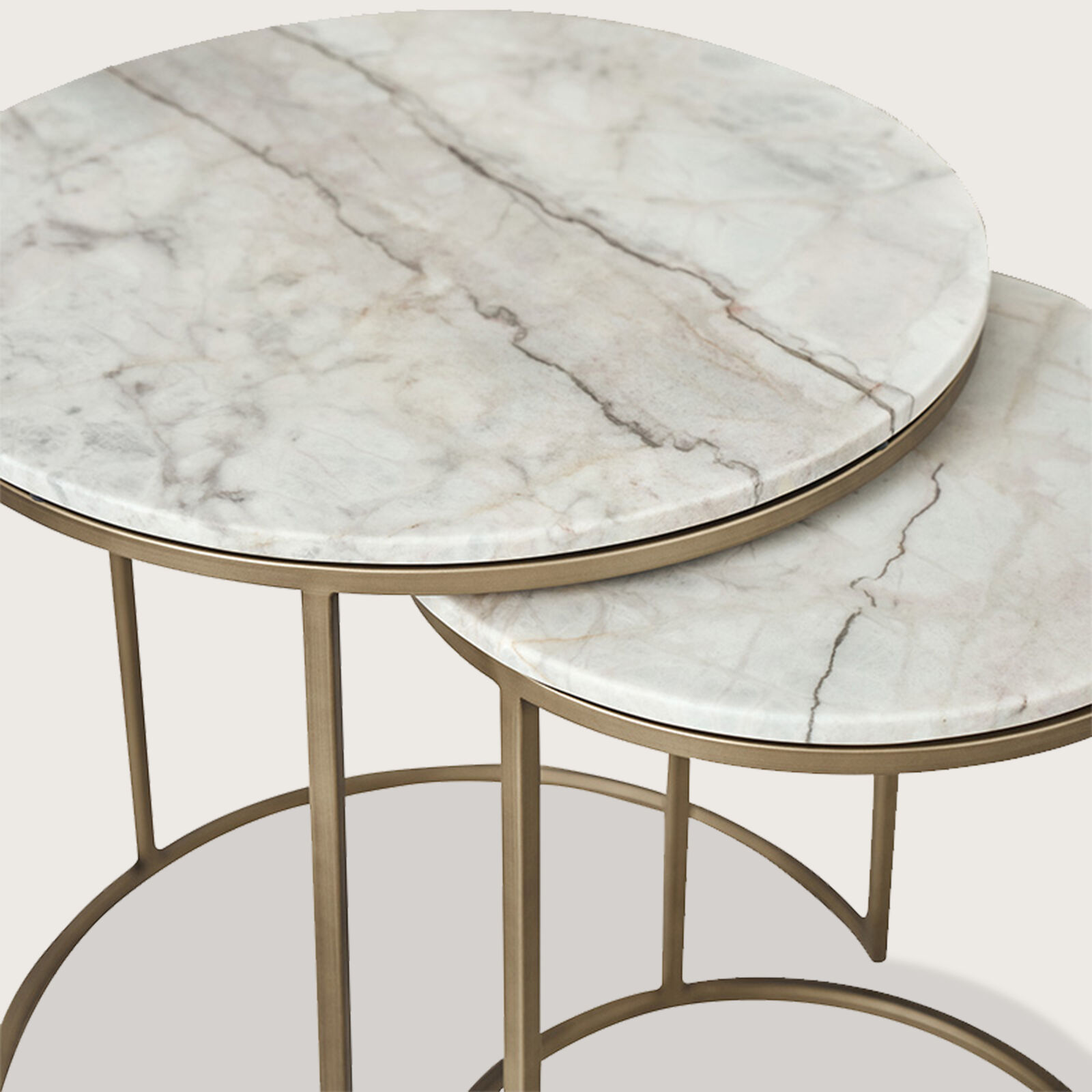 Introducing the Celine Side Nest of Tables, where elegance meets practicality. Each piece features a bronze powder-coated finish, adding a sophisticated touch to your space. The tops are adorned with the timeless beauty of Natural Vitoria Marble, showcasing unique veining and natural elegance. Elevate your decor with this stylish and versatile addition, a perfect fusion of modern design and classic materials, capturing the enduring allure of Natural Vitoria Marble.