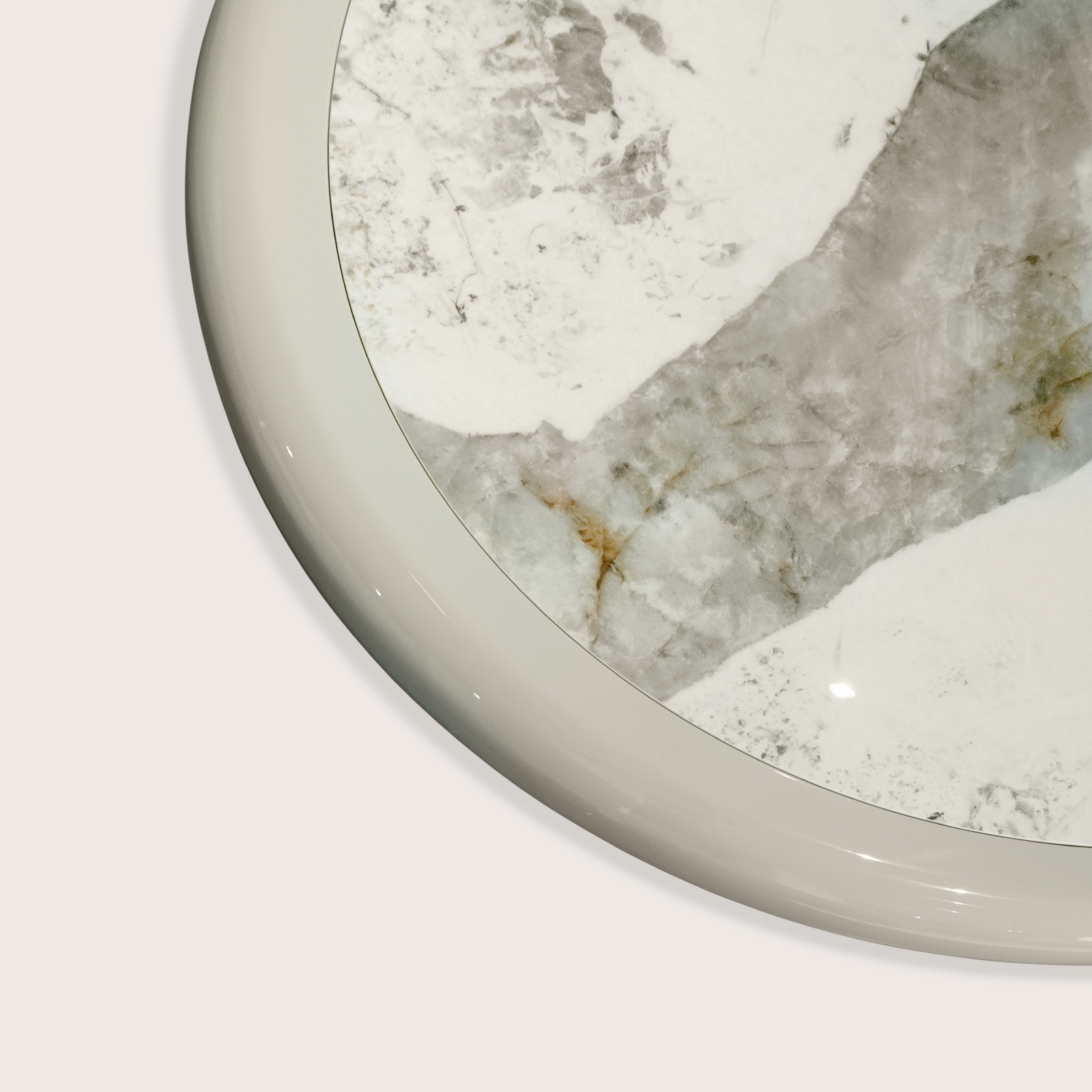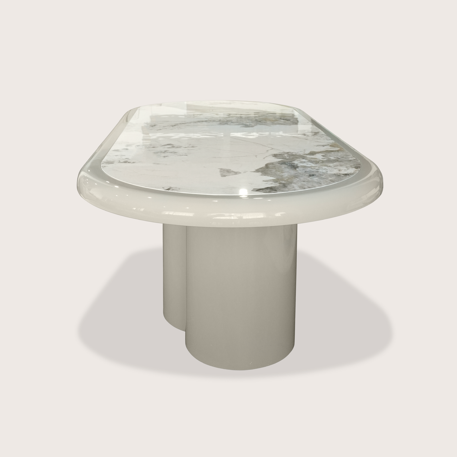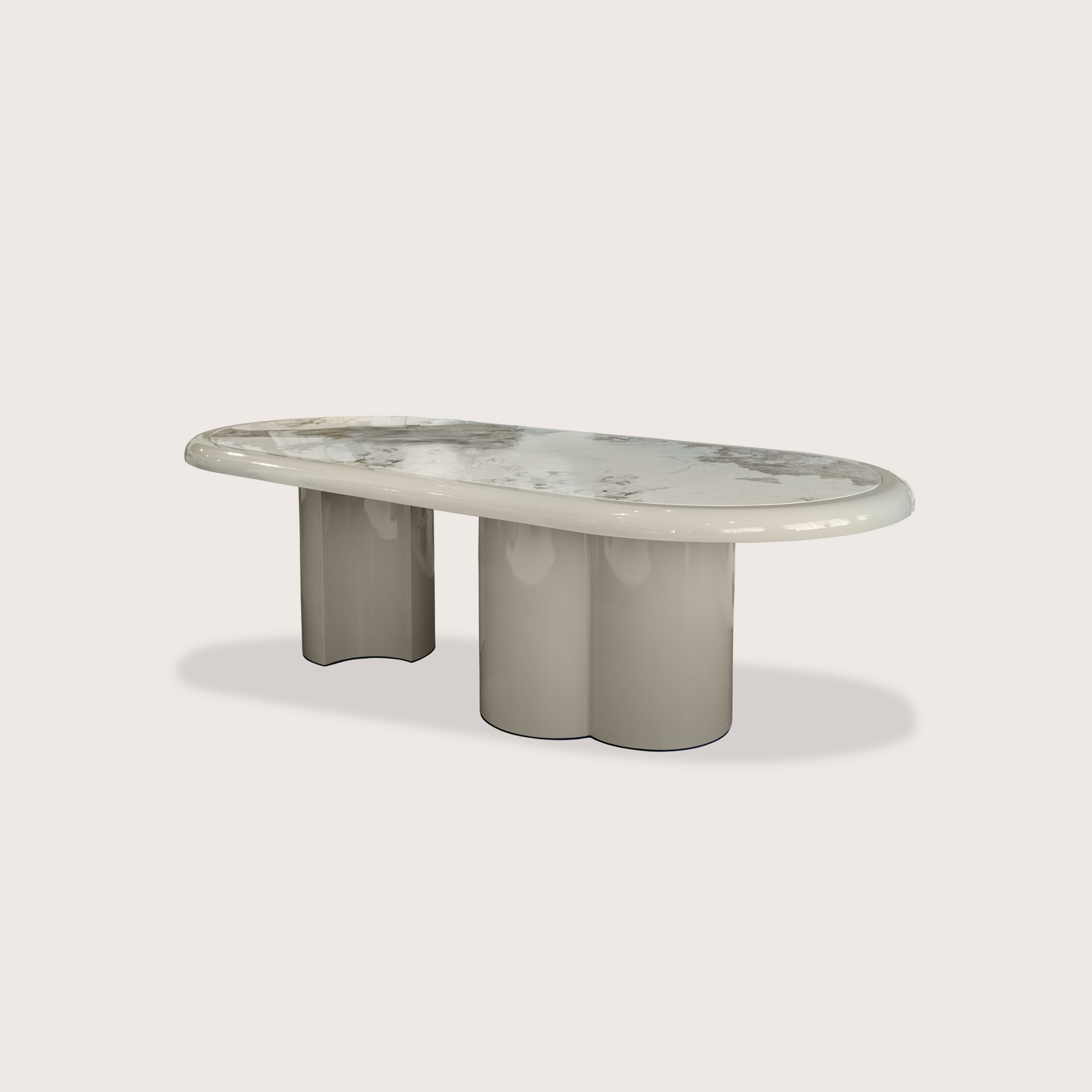 Bold yet refined, the Gabriel dining table is a sculptural centrepiece designed to elevate any dining space. The curved silhouette of its glossy base is echoed by the rounded edges of its luxurious stone top, featuring a beautifully varied grain of soft greys, warm taupes, and creamy whites. Crafted from high-quality natural stone, each tabletop is unique, with organic veining and colour variations that bring depth and character to the design. The oversized cylindrical legs offer striking visual weight while allowing generous legroom and comfortable seating. Ideal for both everyday dining and entertaining, the Gabriel table makes a statement without overpowering the room.
