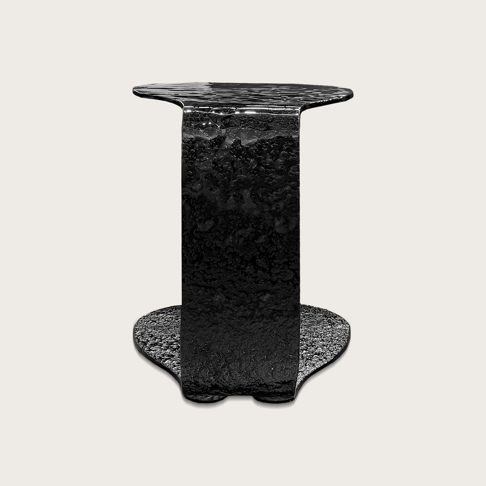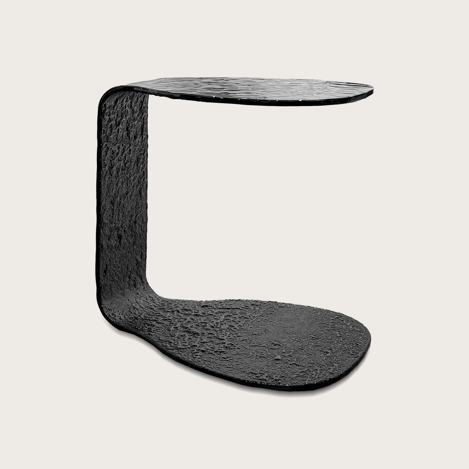 The Infinite Side Table features a textured, tinted black glass surface forming a continuous, modern, and tactile design. Its clean lines and compact size make it a versatile addition to living rooms, bedrooms, or lounge areas. The textured glass construction offers subtle visual depth and a light, airy feel while providing practical surface space, adding a timeless elegance to any interior.
