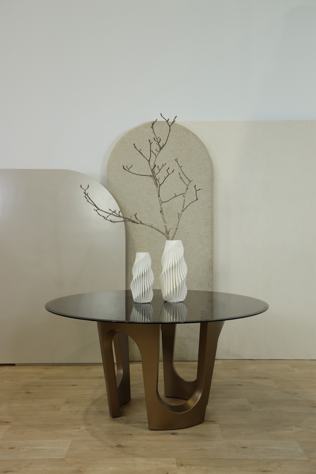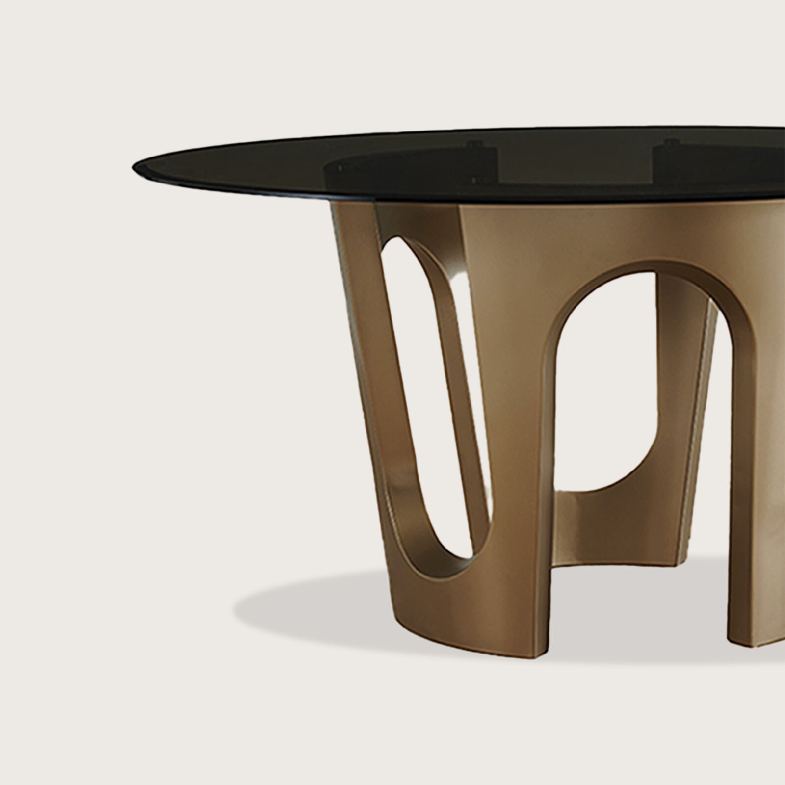 Elevate your dining experience with the Kate Dining Table, featuring a sleek brass base and a sophisticated glass top. This combination of materials creates a contemporary and airy aesthetic, perfect for modern dining spaces. The Kate Dining Table not only enhances your decor with its minimalist design but also offers outstanding elegance, making it a standout piece in your home.