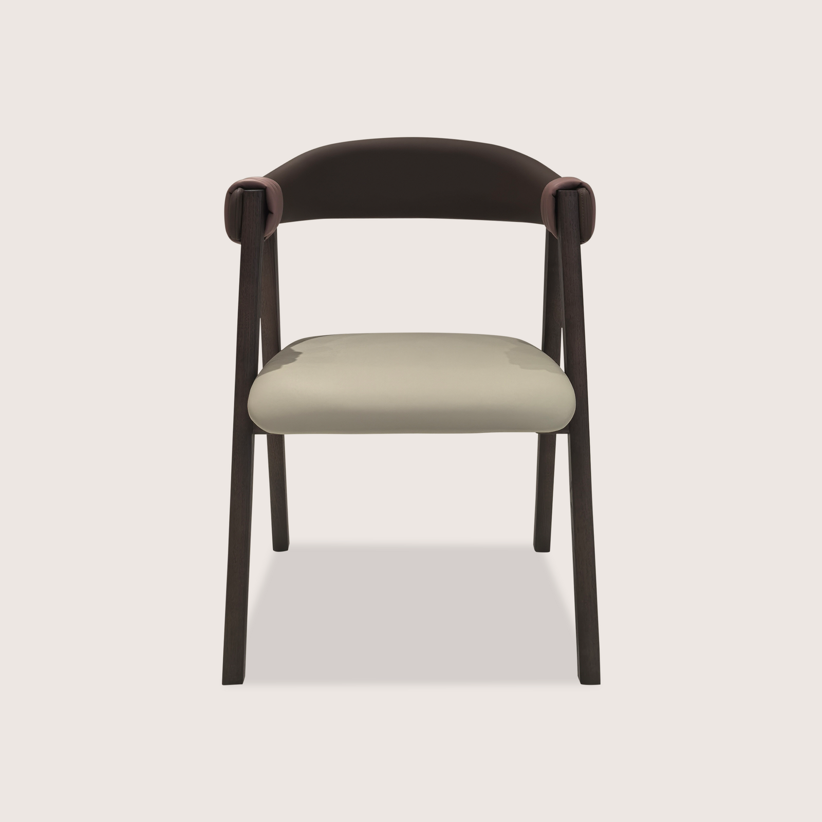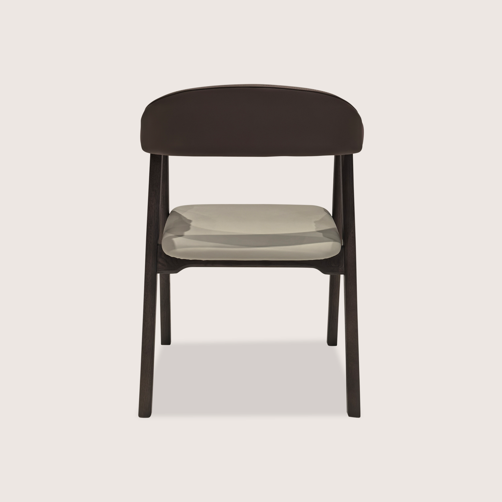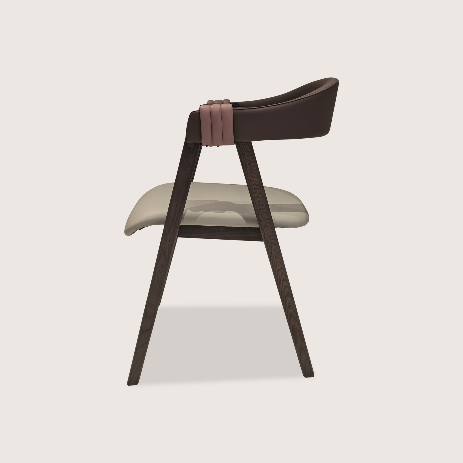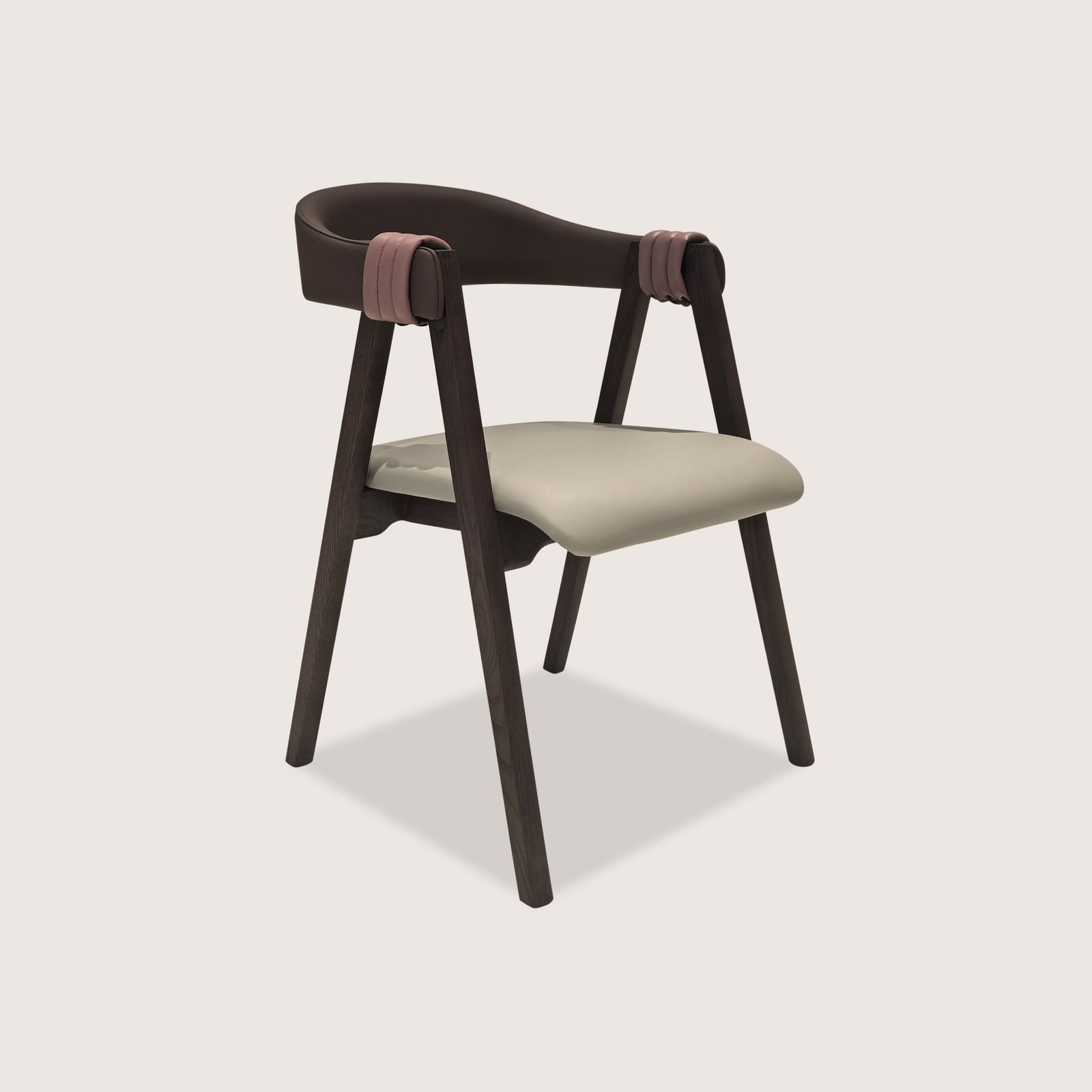 The Louis Chair is a beautifully crafted piece that adds character and style to any space. Its curved eco-leather backrest, detailed with soft pink strap accents, brings a playful yet refined touch. The smooth ivory-toned seat offers comfort and contrast, while the dark timber frame grounds the design with warmth and structure. Whether used as a dining chair or statement piece, the Louis Chair suits interiors that favour considered design and subtle individuality.