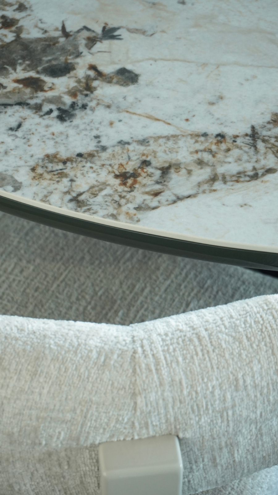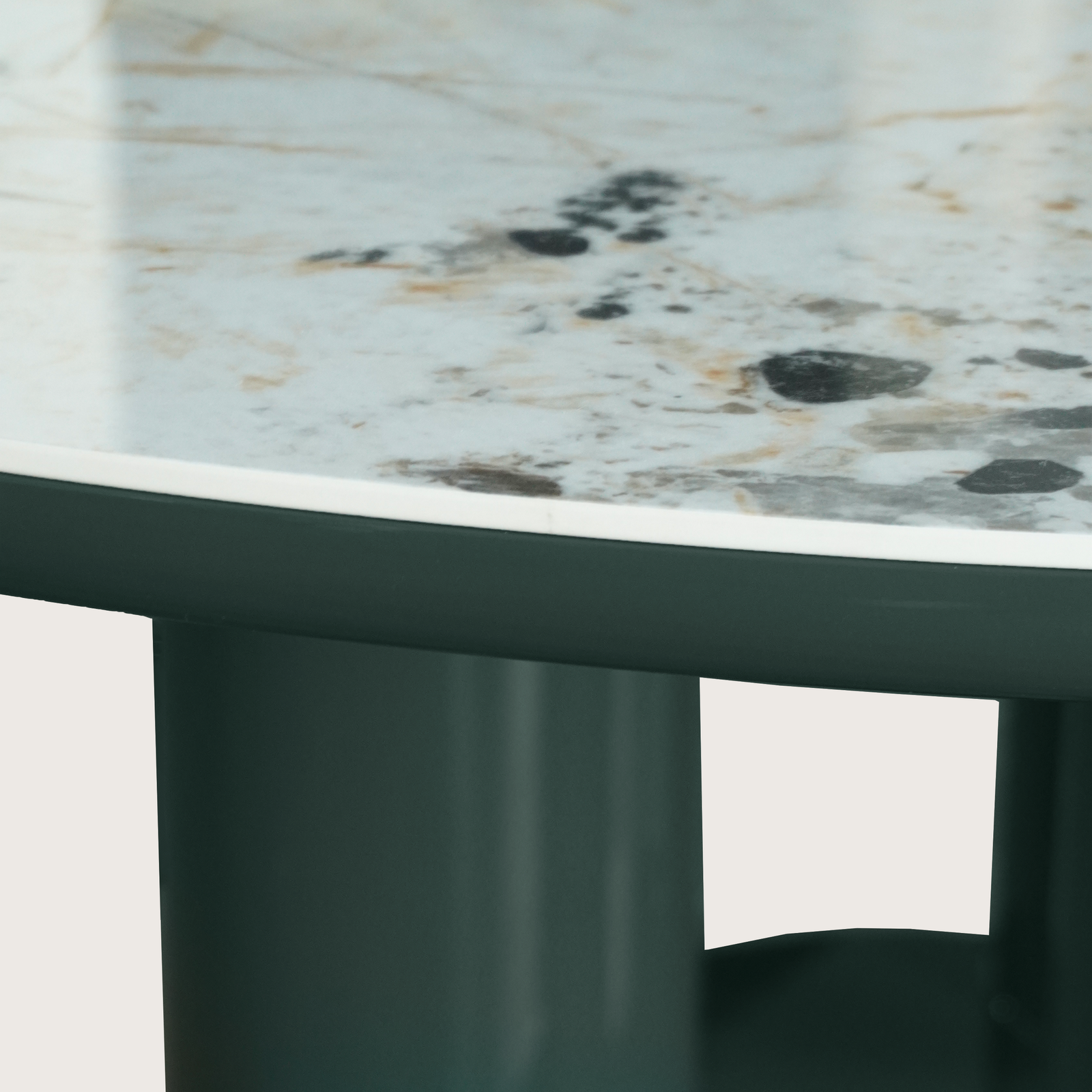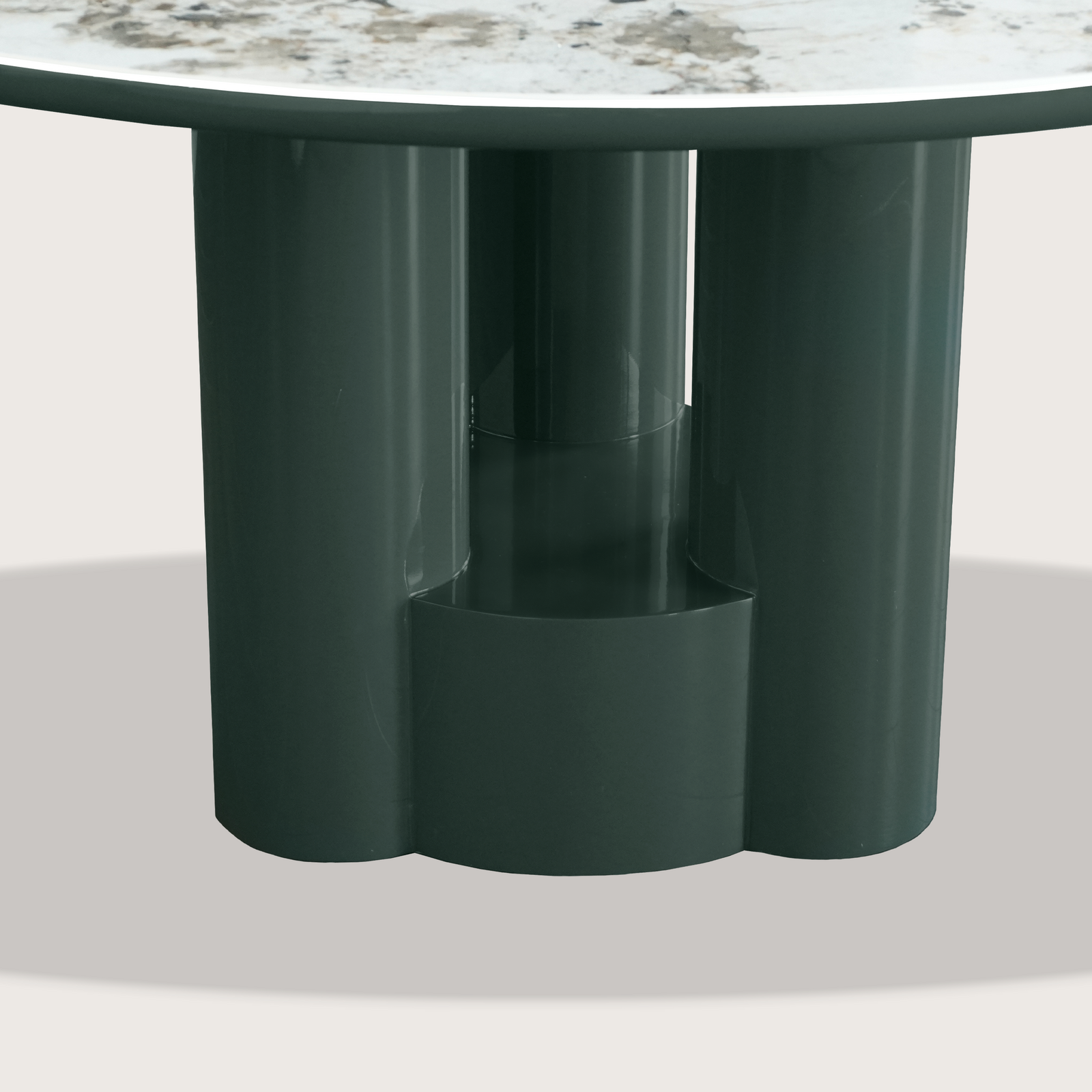 A sulptural centerpiece with timeless appeal, the Lucien Dining Table pairs a neutral-toned marble with a bold pine green poly finish base. Its unique three pillared design adds an element of sophistication and style, making it a standout in any dining space. Perfect for modern Interiors.