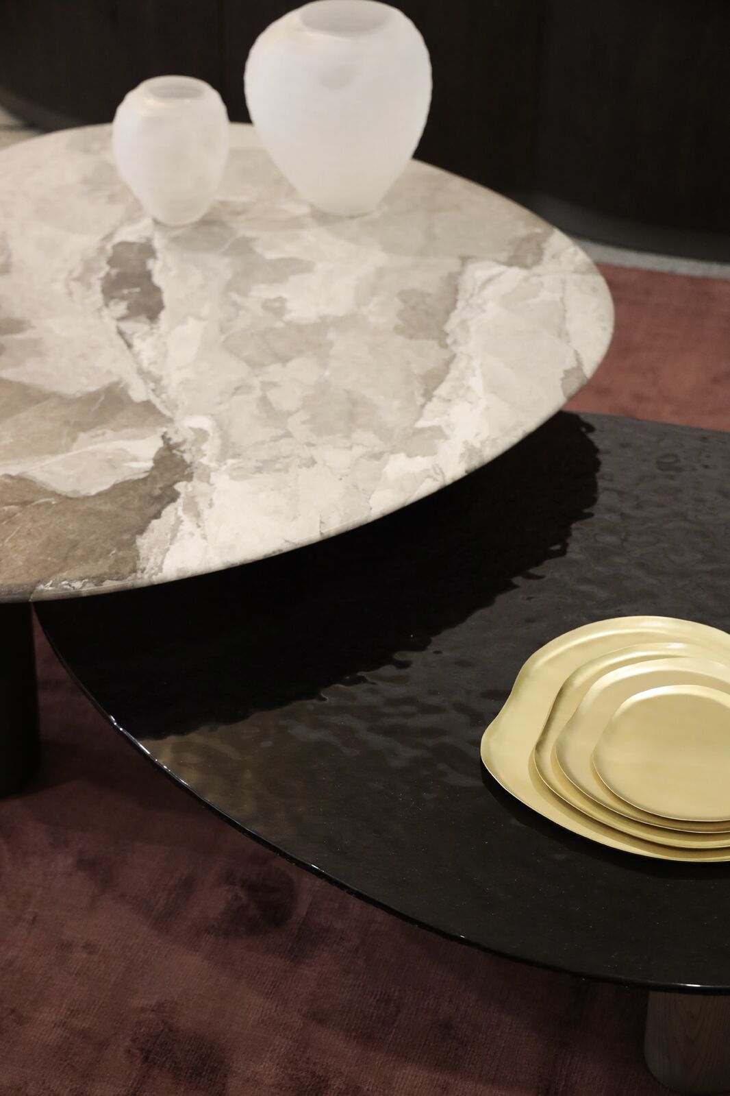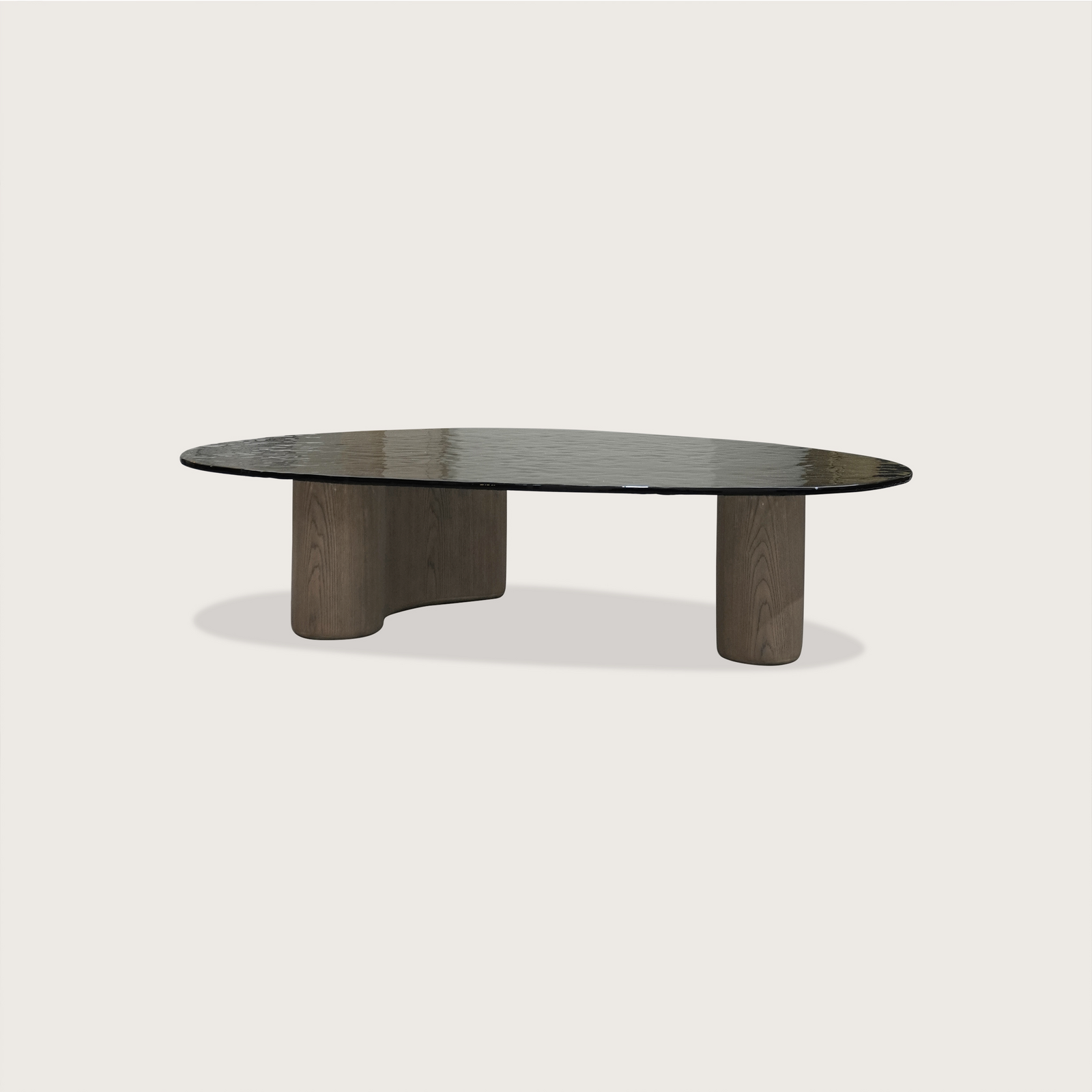 A striking asymmetrical design featuring a sculptural base and a sleek, curved tabletop. Its bold contrast and organic form create a statement of modern elegance. The curved supports offer a distinctive silhouette, while the texured glass keeps the aesthetic light and open. It’s perfect for creating a sense of space in small living areas or enhancing the clean lines of a modern interior.