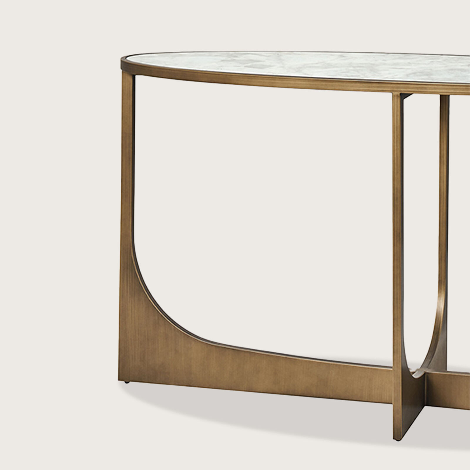 Transform your space with the Natural Vitoria Marble 'Sylvie' Console Table, a statement of refined contrast and style. The sleek black-finished marble top exudes elegance, harmonizing beautifully with the iron frame's brass-coloured powder-coated finish. This console table seamlessly merges natural beauty with contemporary design, offering a stunning addition to your entryway or living area.