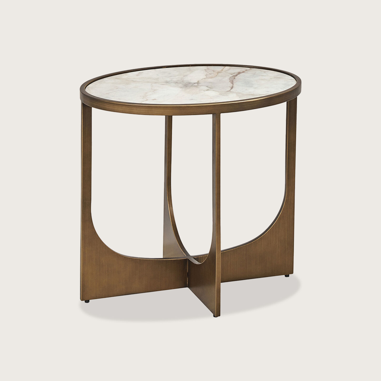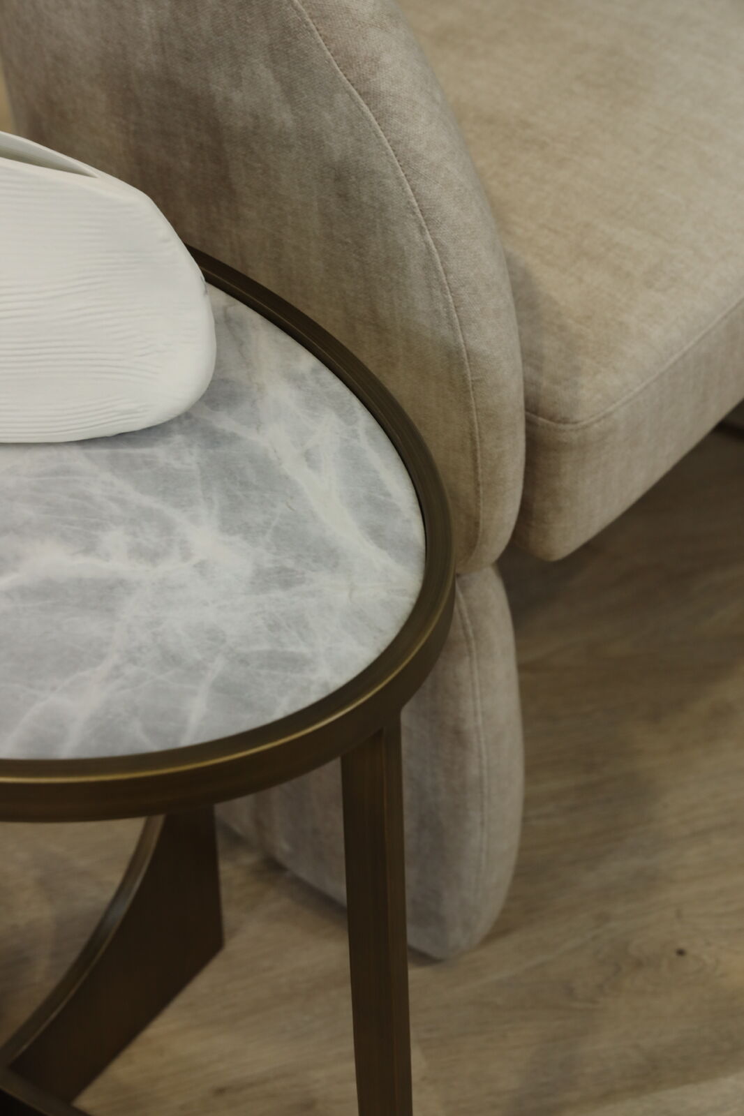 Introducing the Sylvie Side Table, a captivating fusion of sophistication and contrast. The natural vitoria marble top exudes timeless elegance, gracefully complemented by the iron frame's brass-coloured powder-coated finish. Elevate your space with this unique end table, where the beauty of natural marble meets the modern allure of brass-accented craftsmanship.